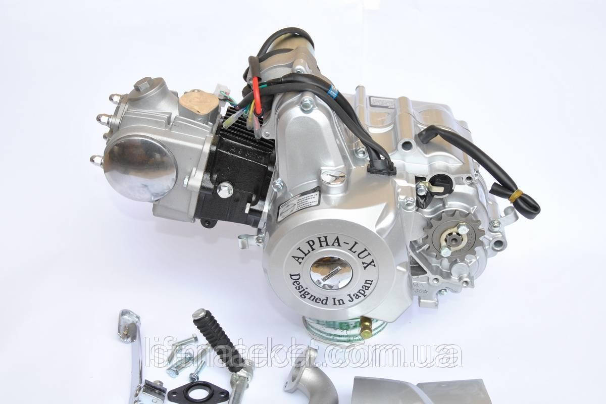 Двигун для мопеду Альфа, Дельта, Актив 125 см3, механіка. У комплектацію входить: ніжка перемикання передач, заводна ніжка, перехідник карбюратор-головка ГРМ, текстолітова прокладка, свічка, захисний кожух провідної зірочки, виробник — ALFA LUX