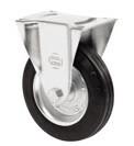 Колесо промислове Ø 200 мм на неповоротному (глухому) кронштейні. Диск колеса пресований із листової сталі, оцинкований і хромований. Шина з литої гуми чорного кольору. Встановлений у ступці роликовий підшипник не вимагає особливого обслуговування. Кронштейн колеса пресований із листової сталі, оцинкований і хромований. Ось колеса на болту. Використовуються як у приміщенні, так і поза такими. Стійкі до впливів довкілля, практично не вимагають догляду та вирізняються тривалим терміном експлуатації. У разі різких перебудувань можуть залишати сліди. Швидкість пересування до 4 км/год. Прекрасне поєднання ціна/якість, ідеально підходять для бюджетного розв'язання питання пересування за невеликих навантажень.